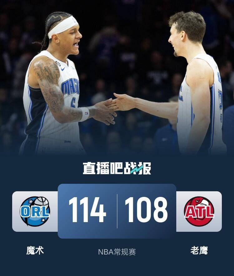 比赛上来,双方短暂拉锯后老鹰突然发力,他们轰出一波17-1的攻势将分差拉开到两位数,次节班凯罗终于迎来大爆发,他单节轰下18分带领球队实现反超,半场结束时老鹰反而落后1分;下半场回来,魔术继续占据着场上的主动权,班凯罗和小瓦格纳联手拿到17分,老鹰的进攻则是继续走低,末节上来,特雷-杨防守端陷入疯狂,不到三分钟就有4犯加1技犯送出,不过老鹰还是将比分追了回来,关键时刻安东尼和班凯罗连中三分稍稍拉开分差,老鹰没有再获得机会,最终魔术力克老鹰获得连胜。