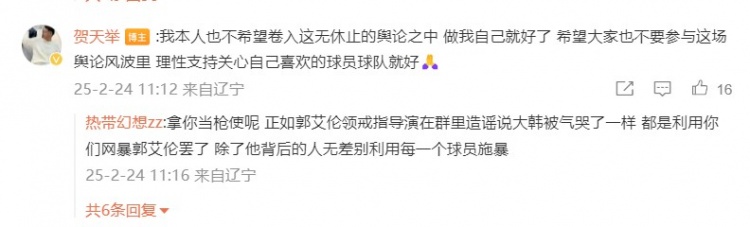 之后,贺天举还在这条动态的评论区写道:“我本人也不希望卷入这无休止的舆论之中 做我自己就好了 希望大家也不要参与这场舆论风波里 理性支持关心自己喜欢的球员球队就好”